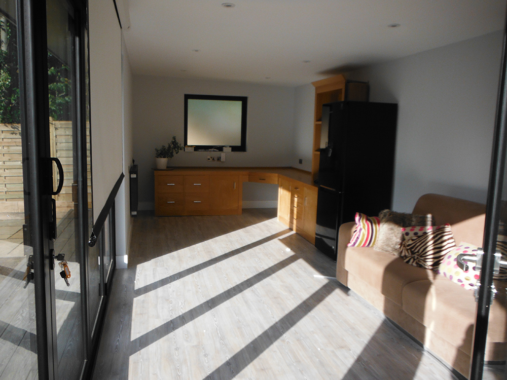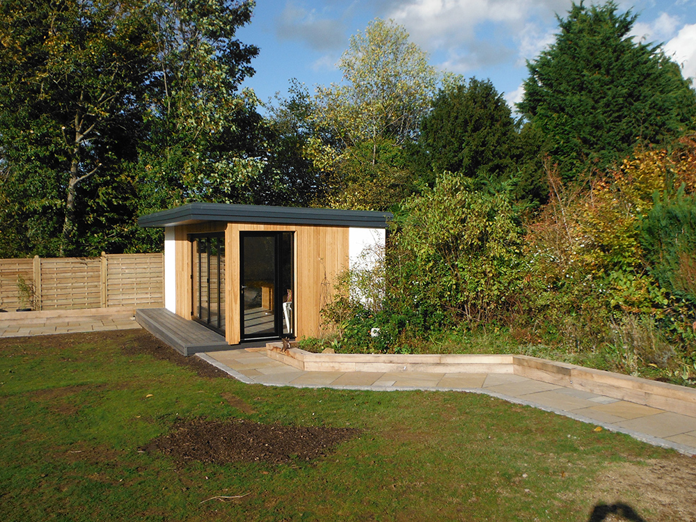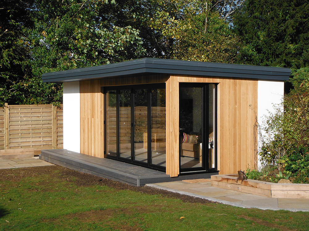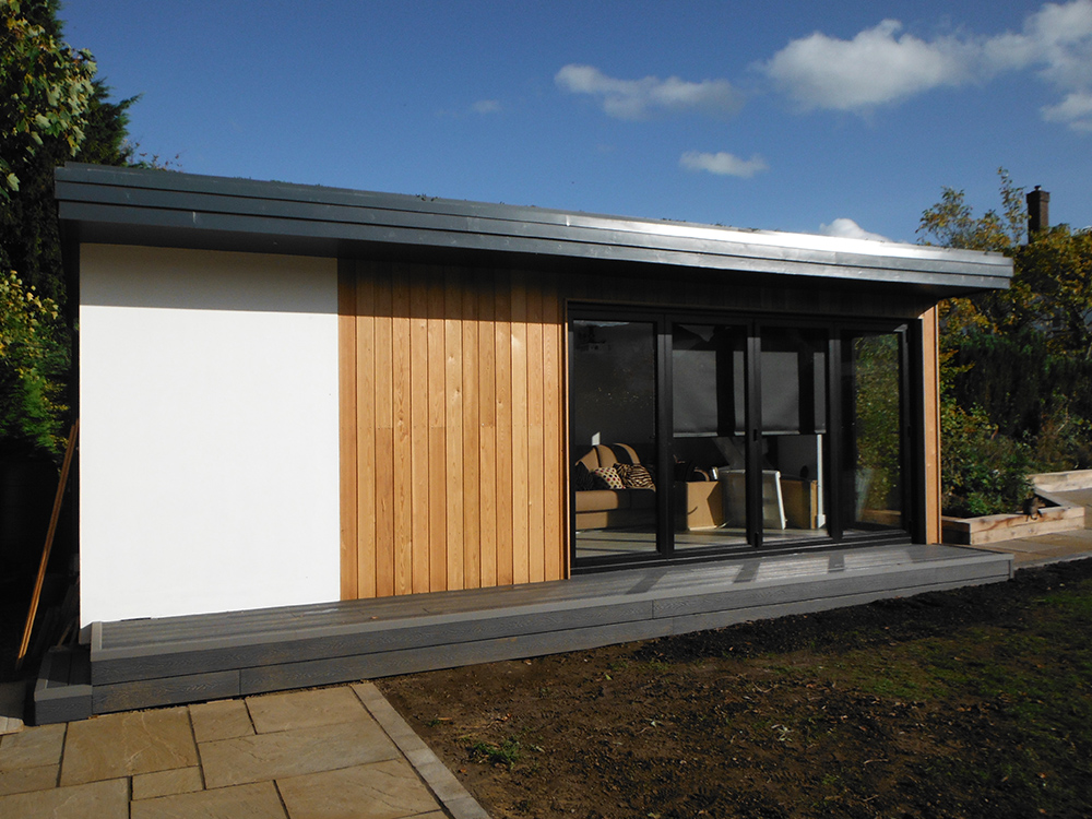Finished with cedar & white render. Roof of Sedum (grass) to blend the building with the garden when viewed from the main house.