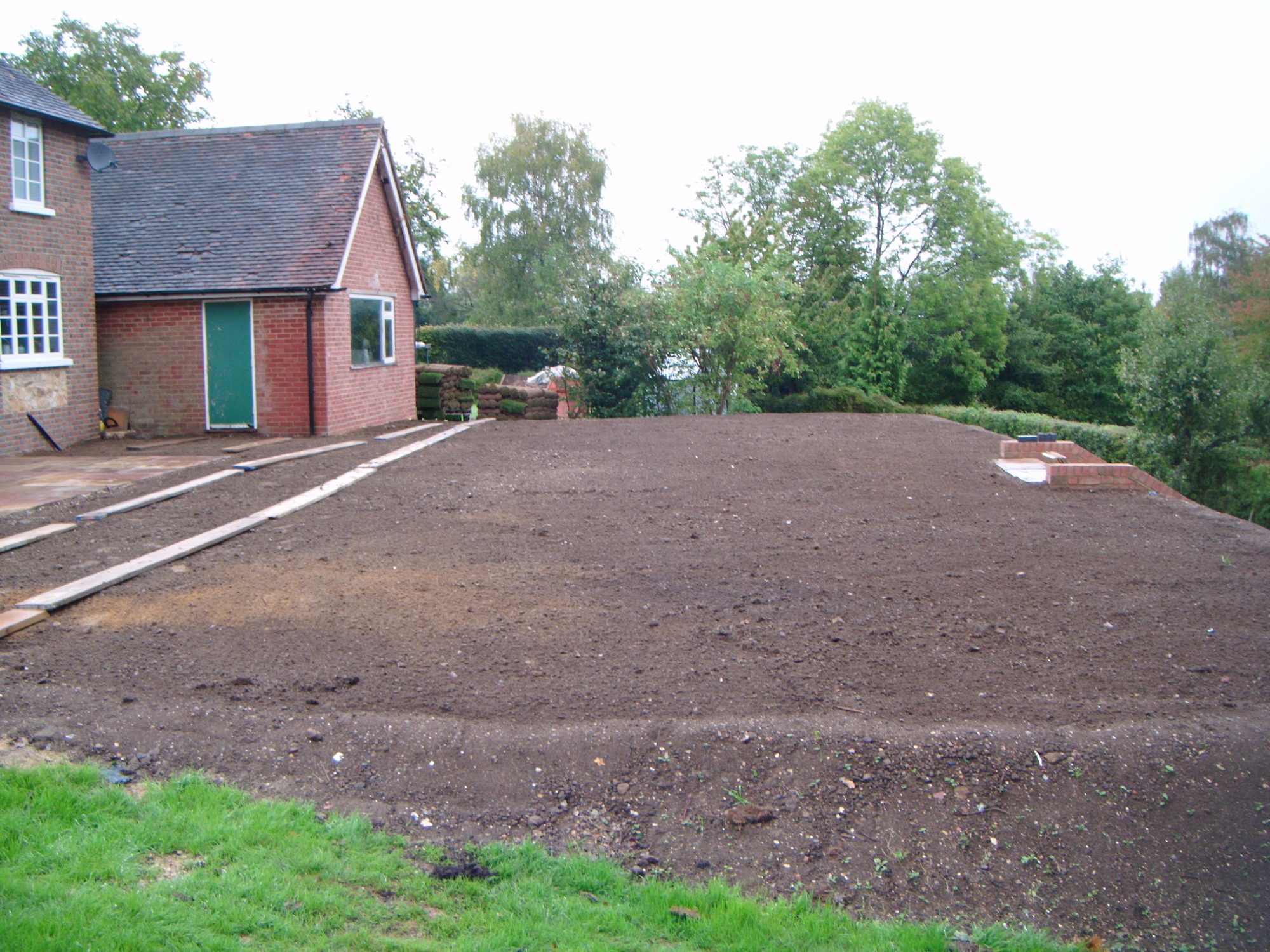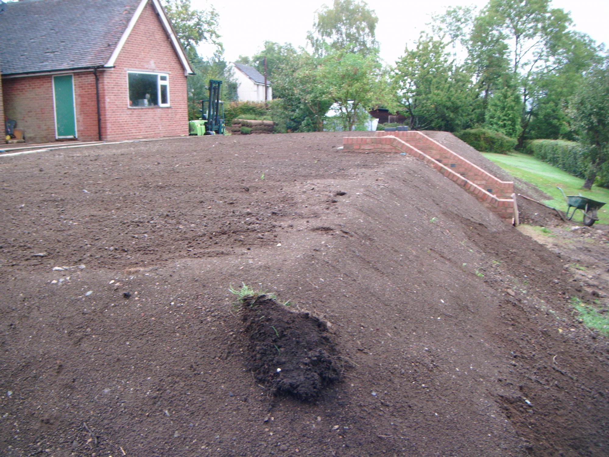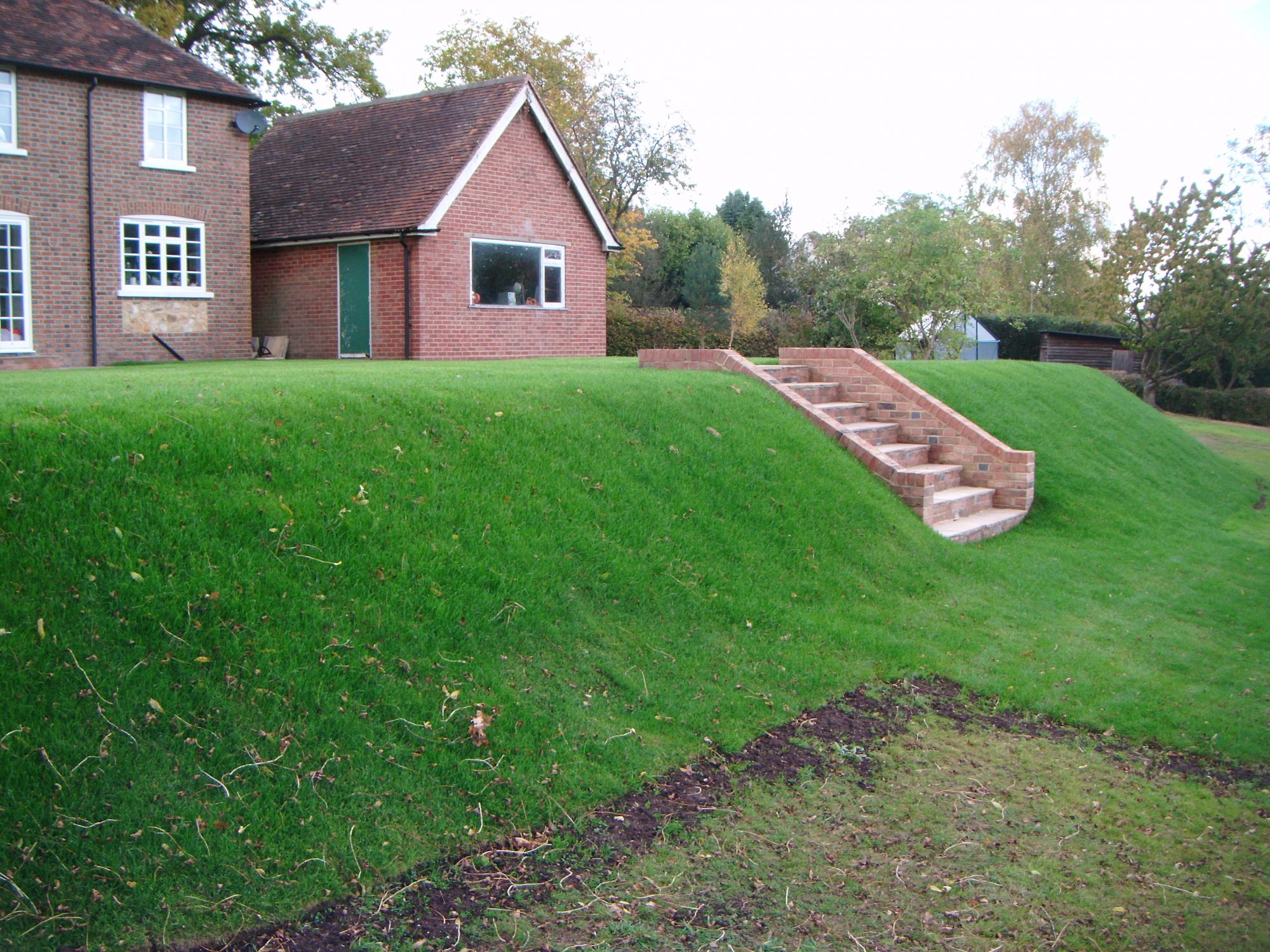 A difficult, previously sloping garden given new functionality with retaining walls hidden below sloping grass bank, patio and brickwork steps. Also fully turfed.