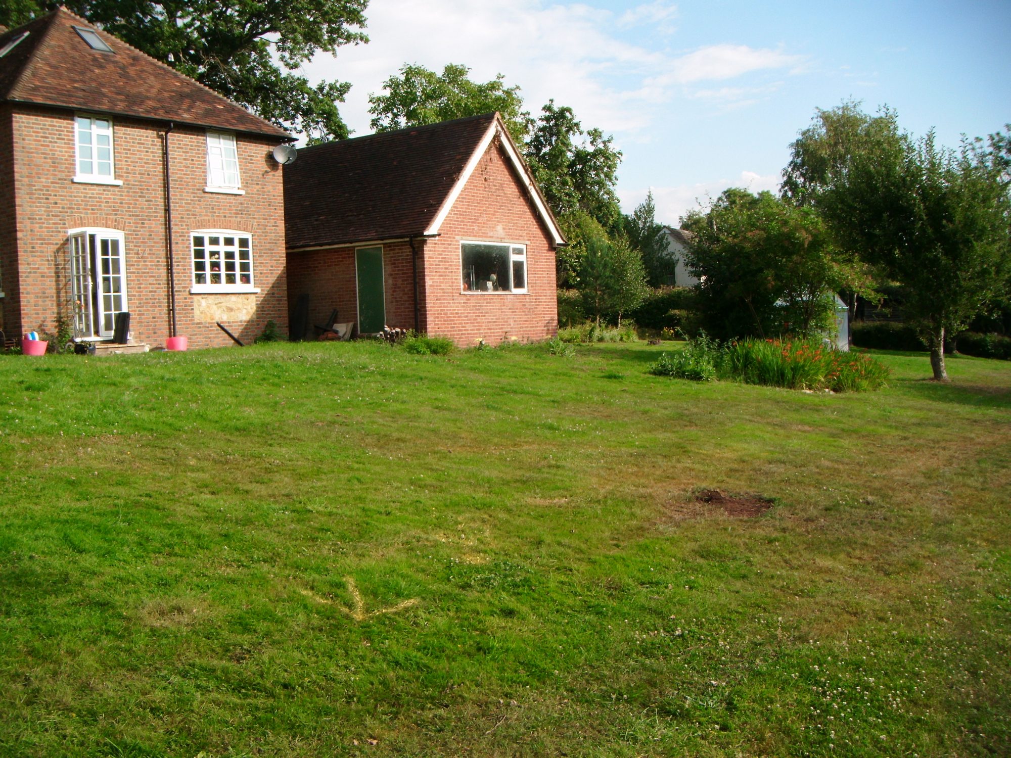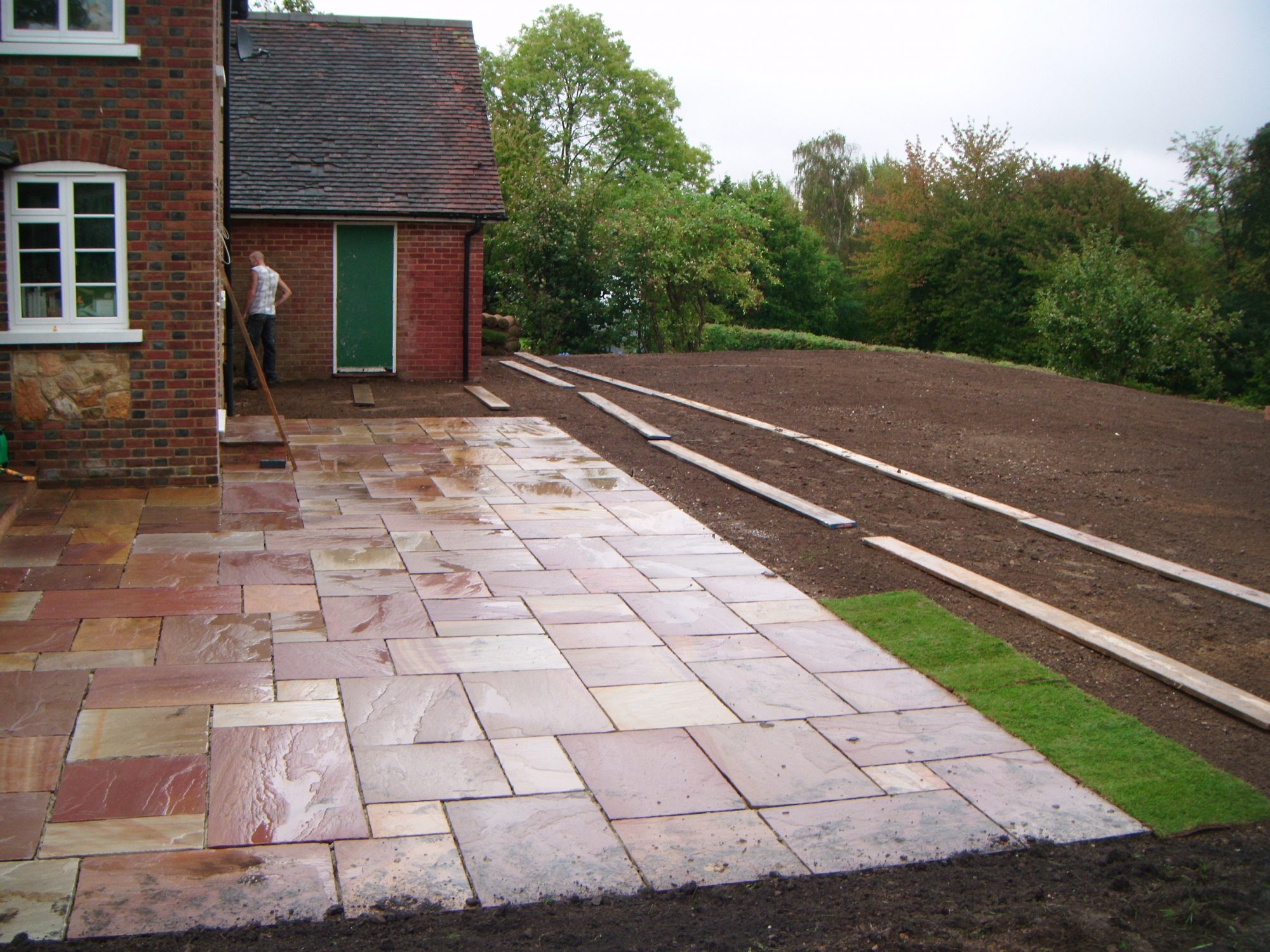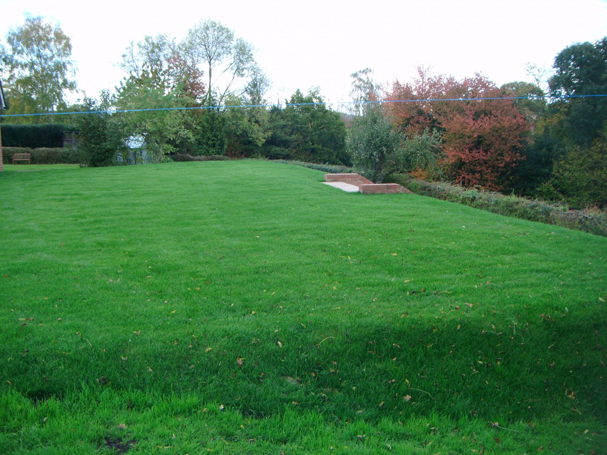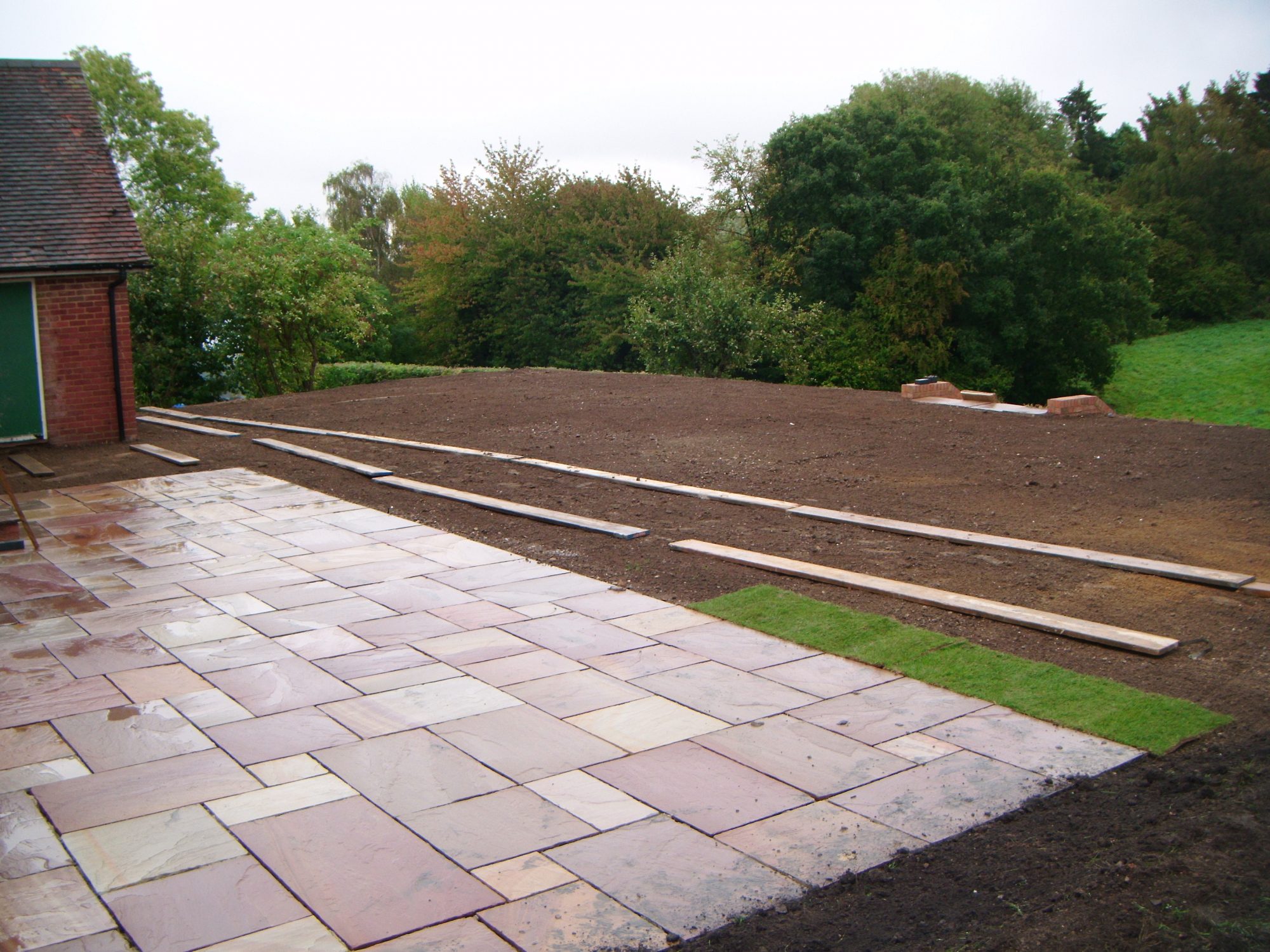 A difficult, previously sloping garden given new functionality with retaining walls hidden below sloping grass bank, patio and brickwork steps. Also fully turfed.