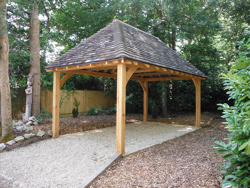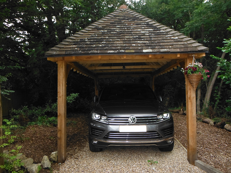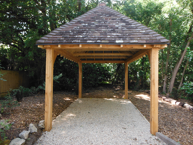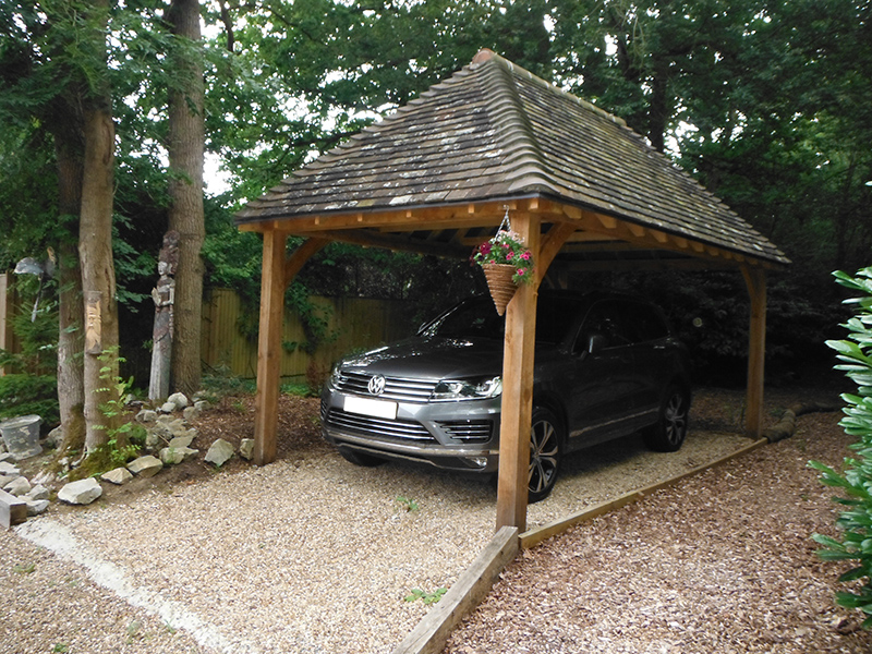Single oak-framed car port with gravel base. Roofed with reclaimed tiles to complement and blend with the house.