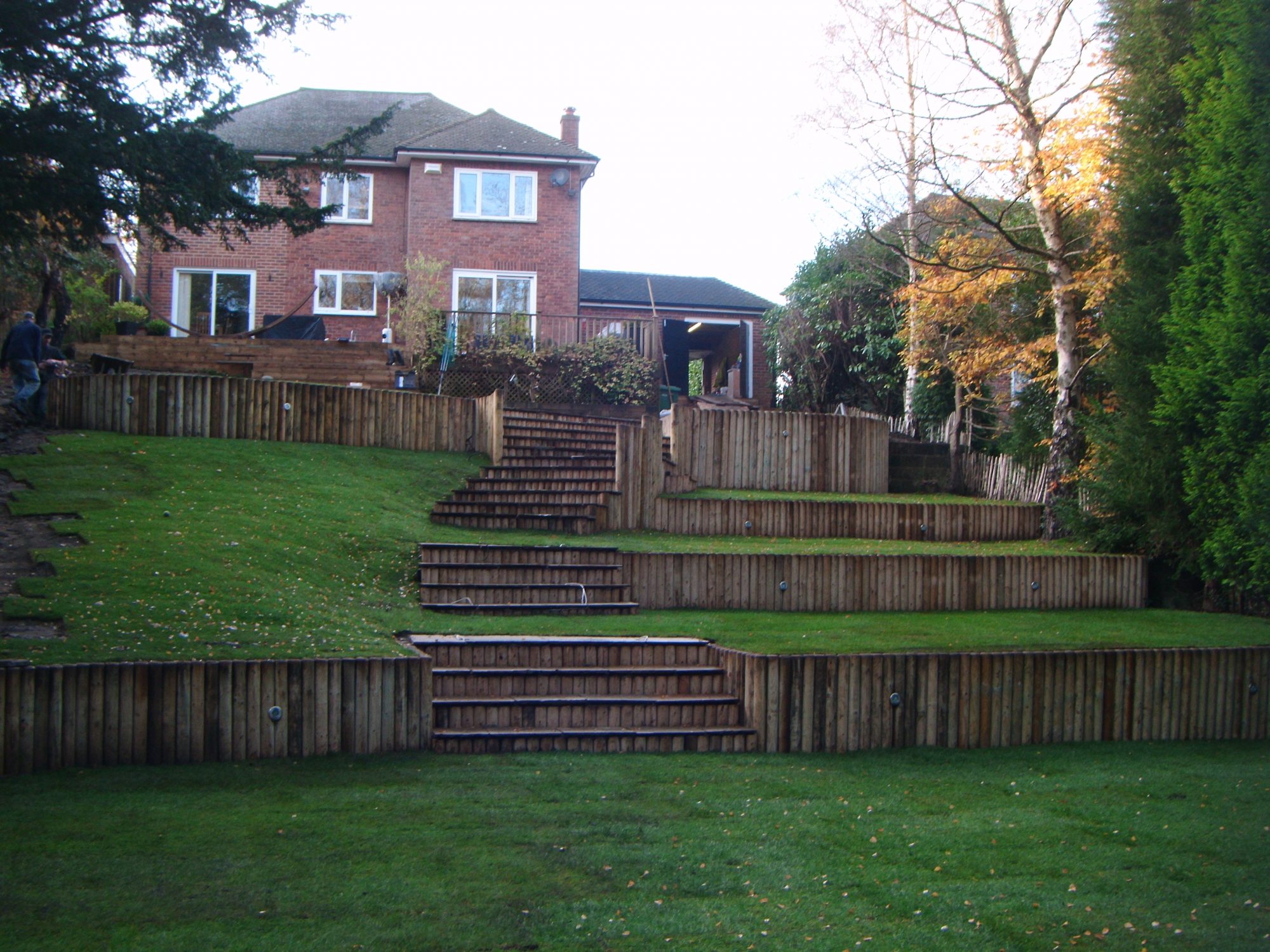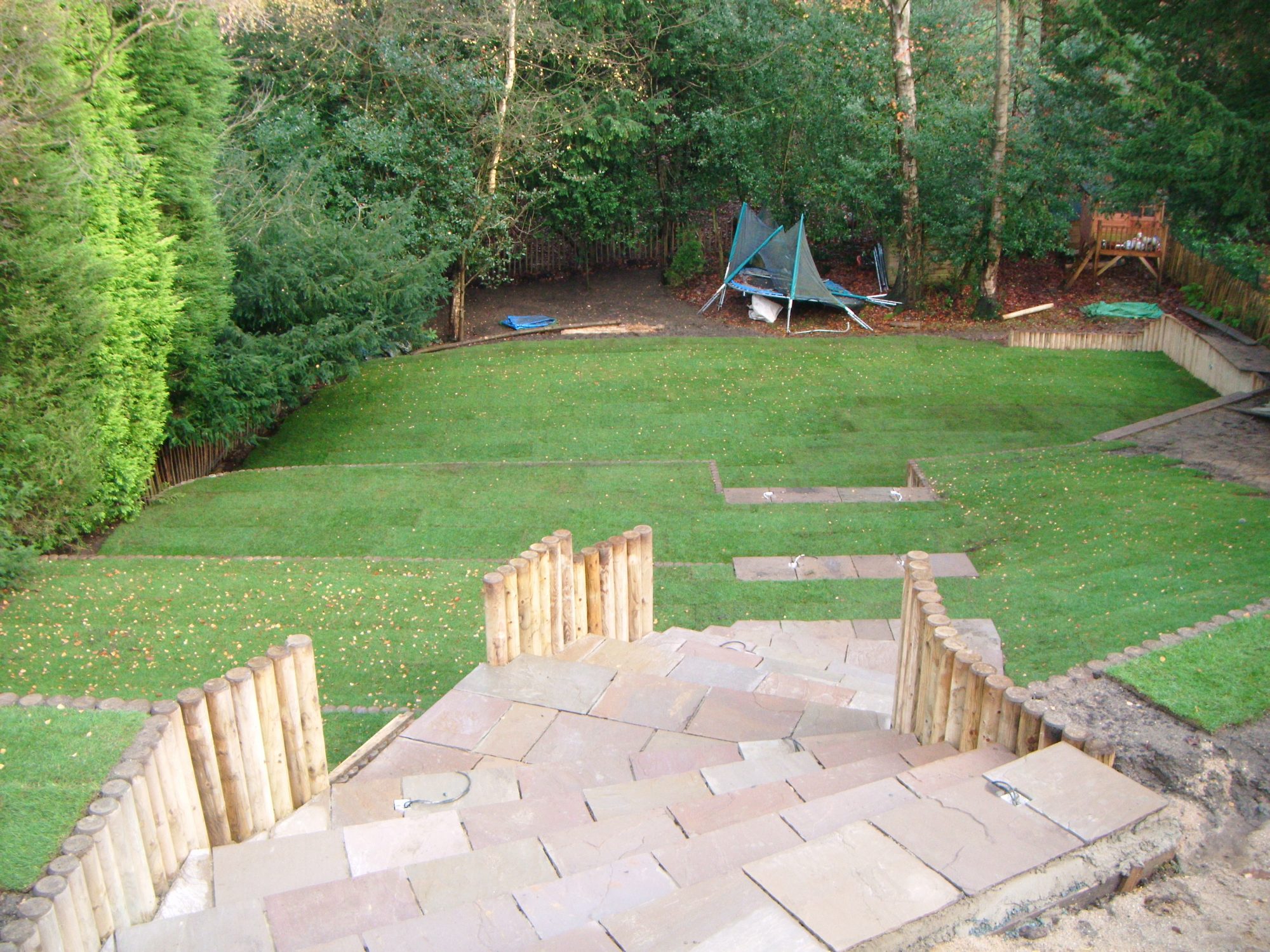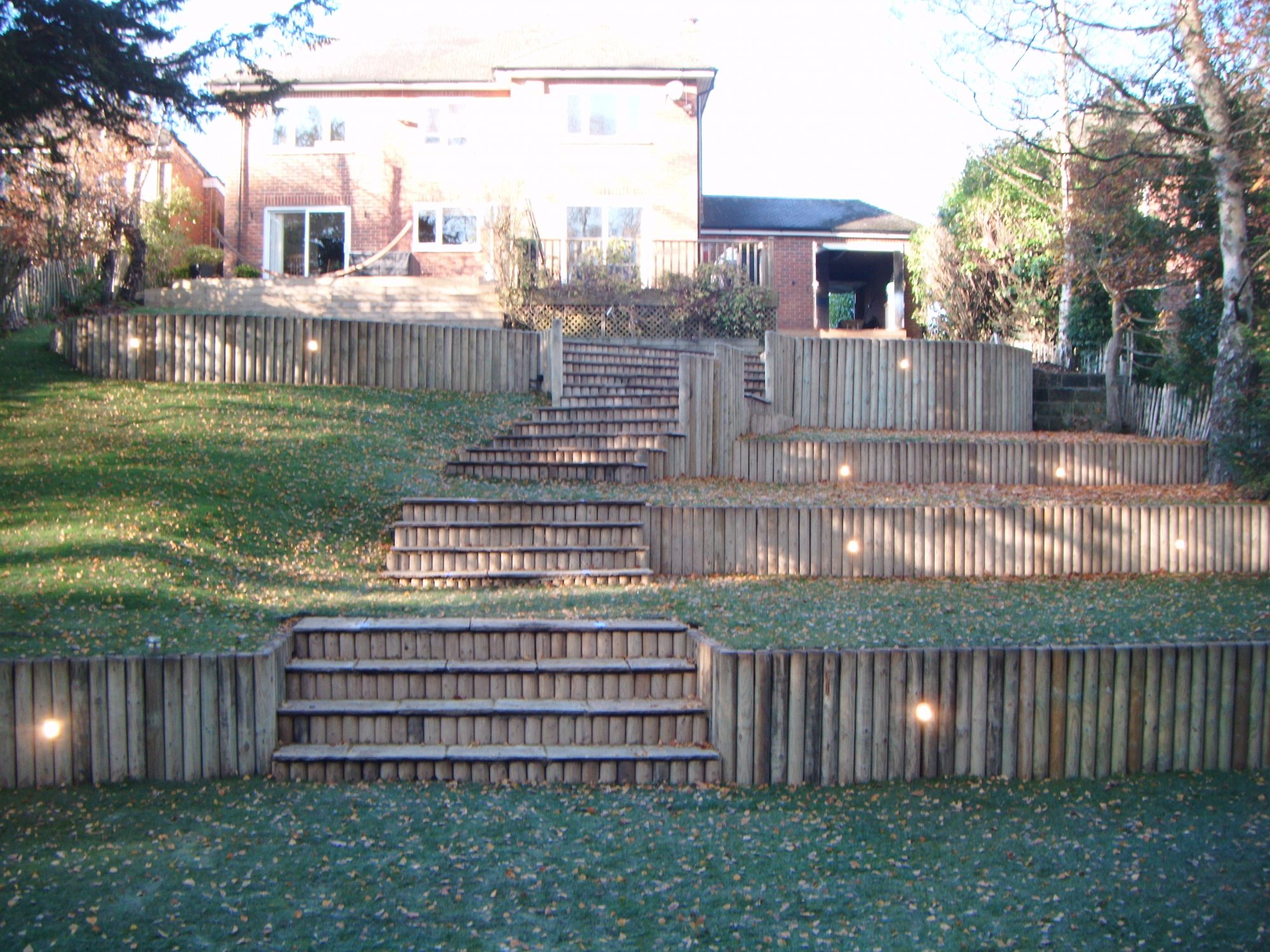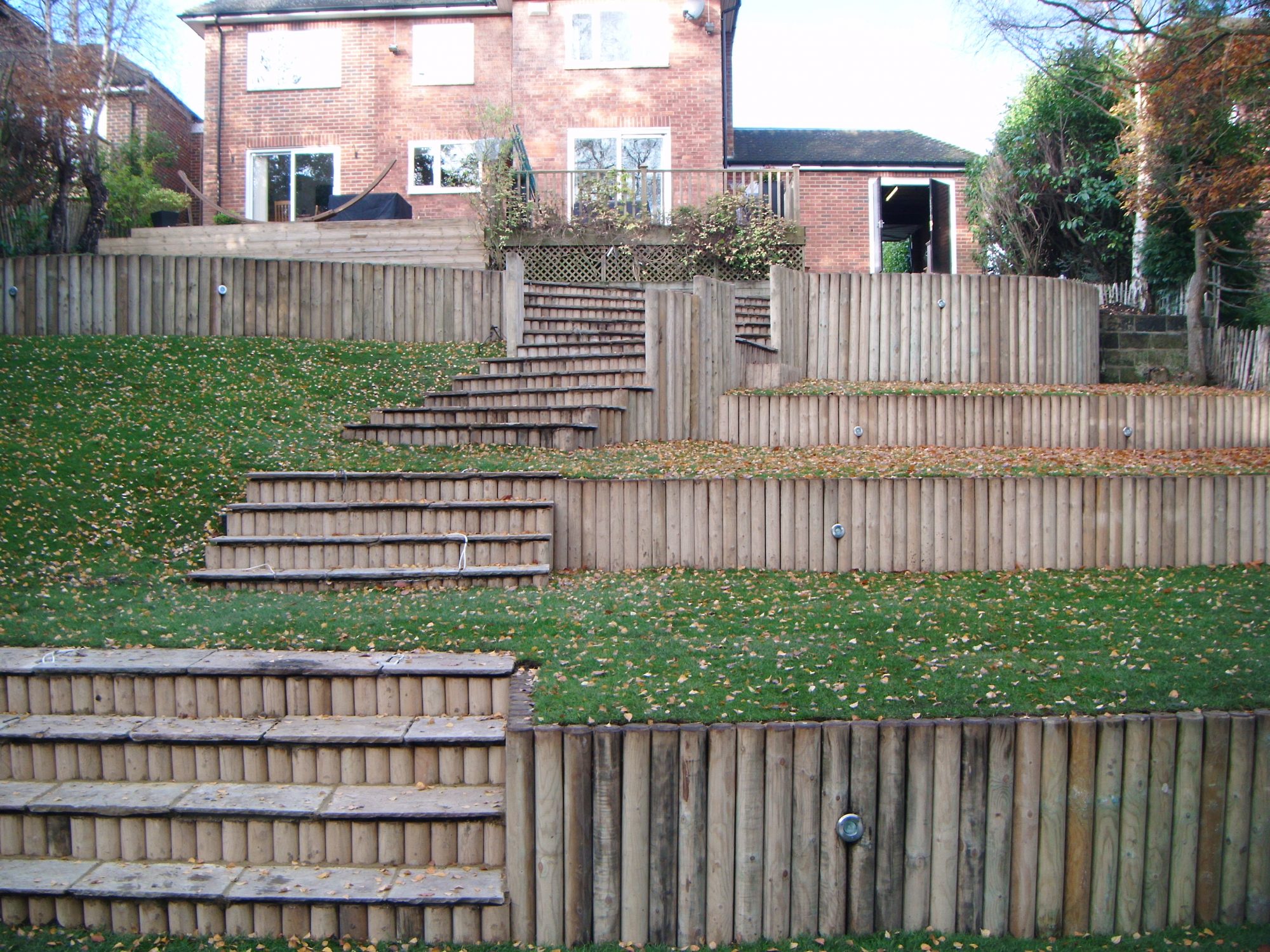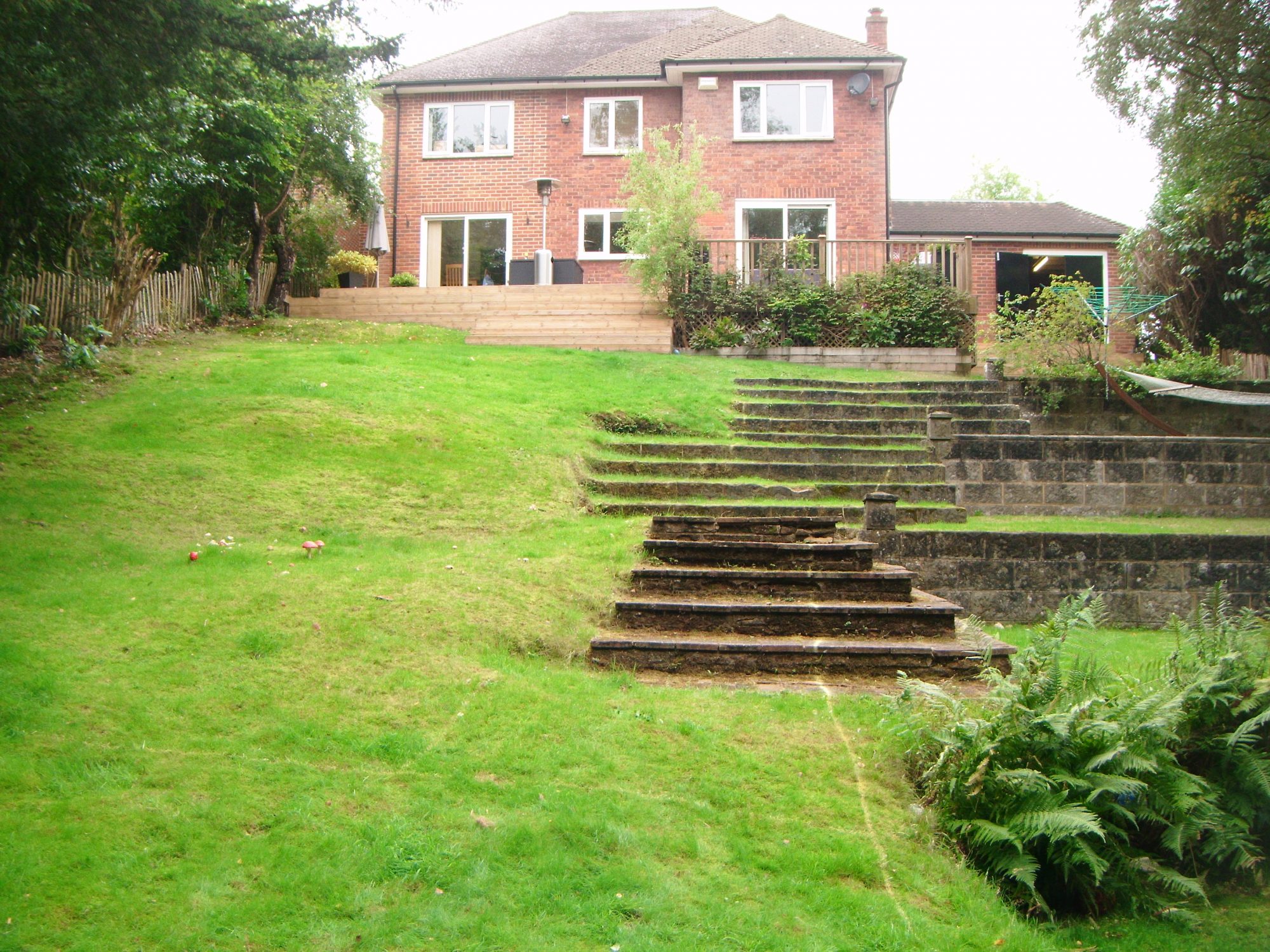 A previously inhospitable steeply sloping garden improved with a number of terraced areas utilising 500 wooden posts. Steps, also included were built with Indian sandstone.