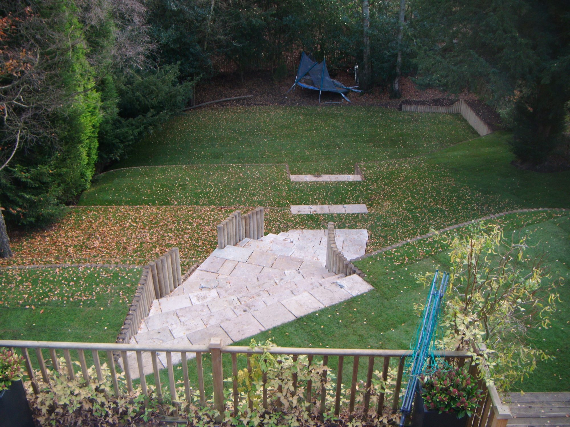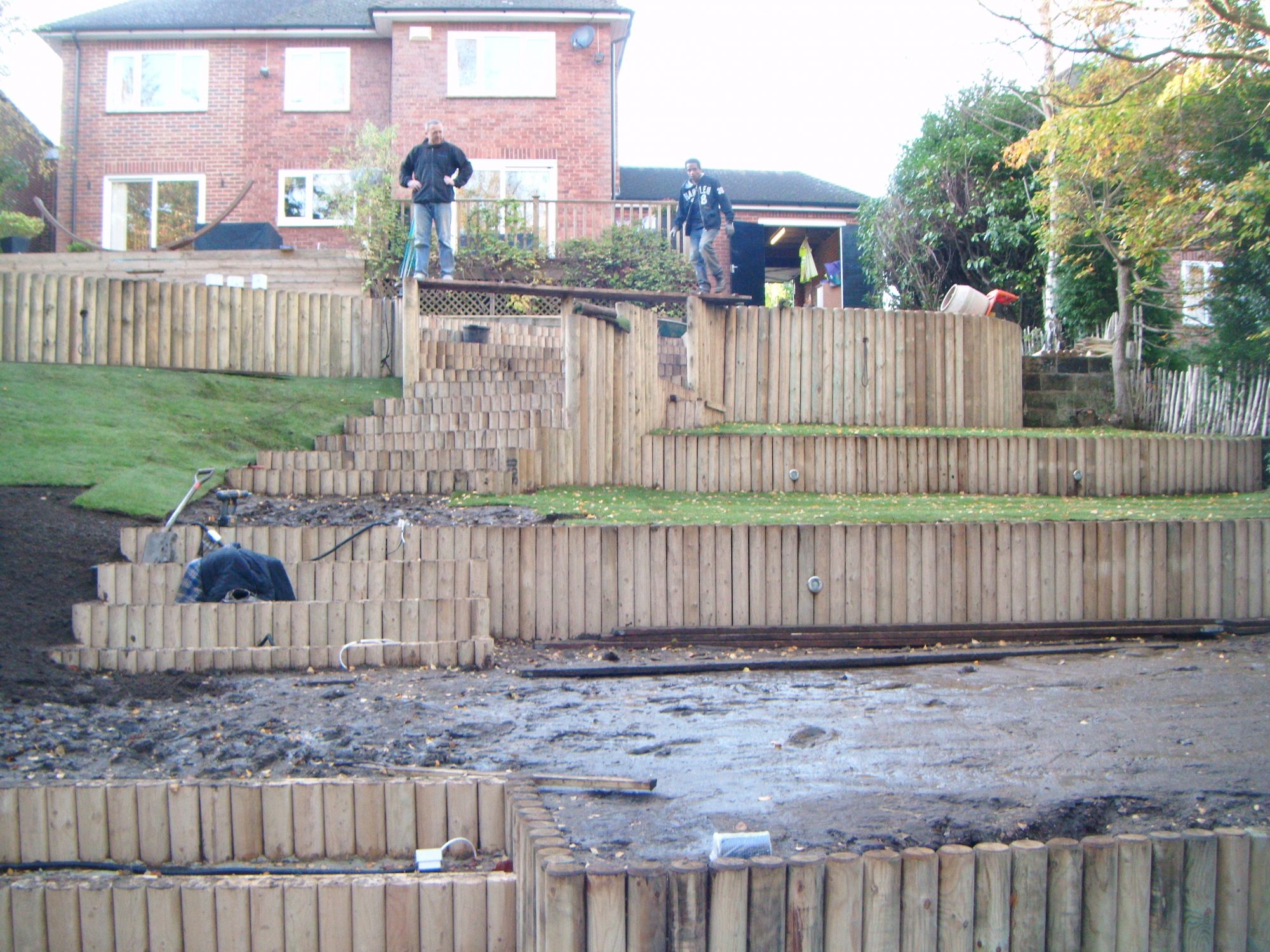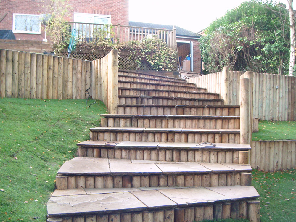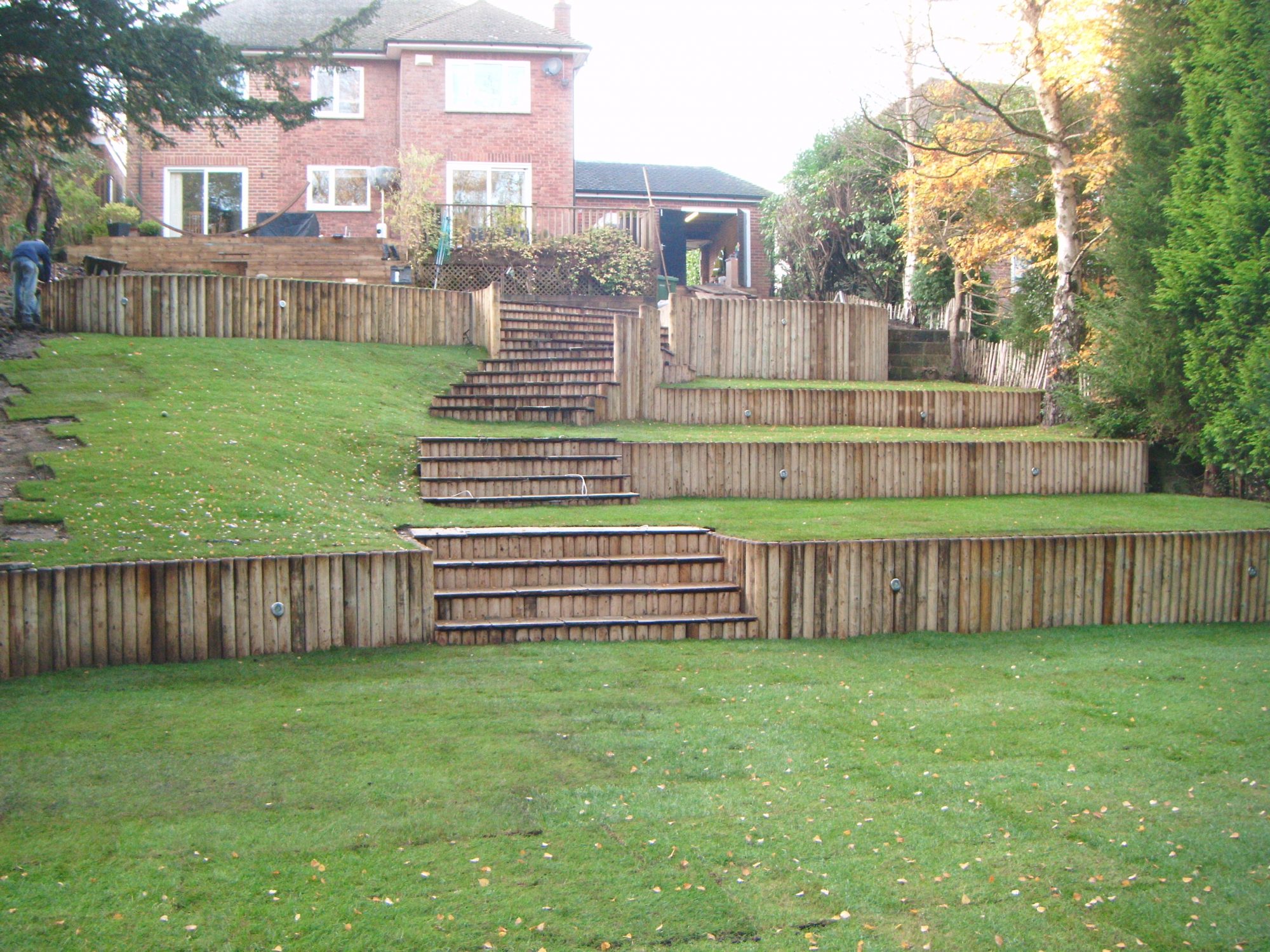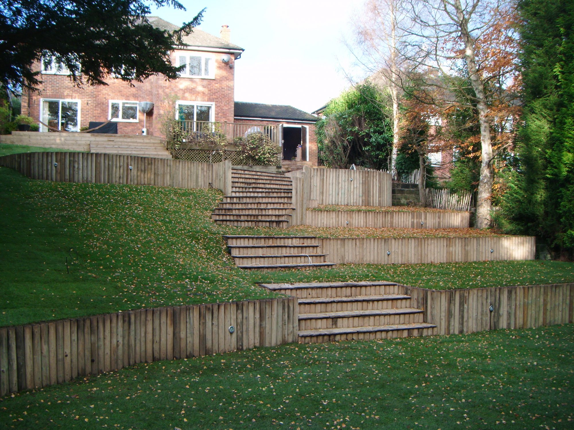 A previously inhospitable steeply sloping garden improved with a number of terraced areas utilising 500 wooden posts. Steps, also included were built with Indian sandstone.