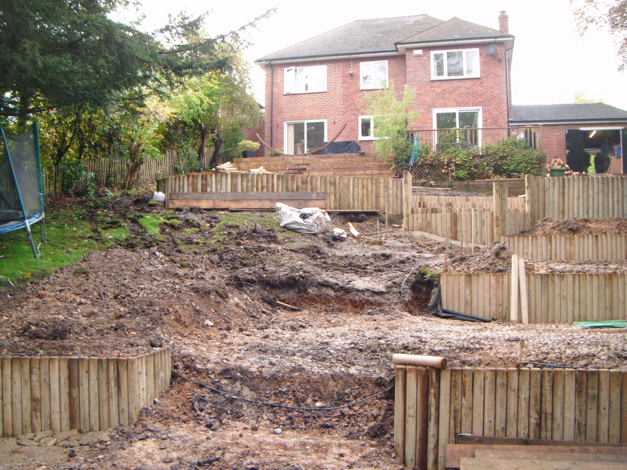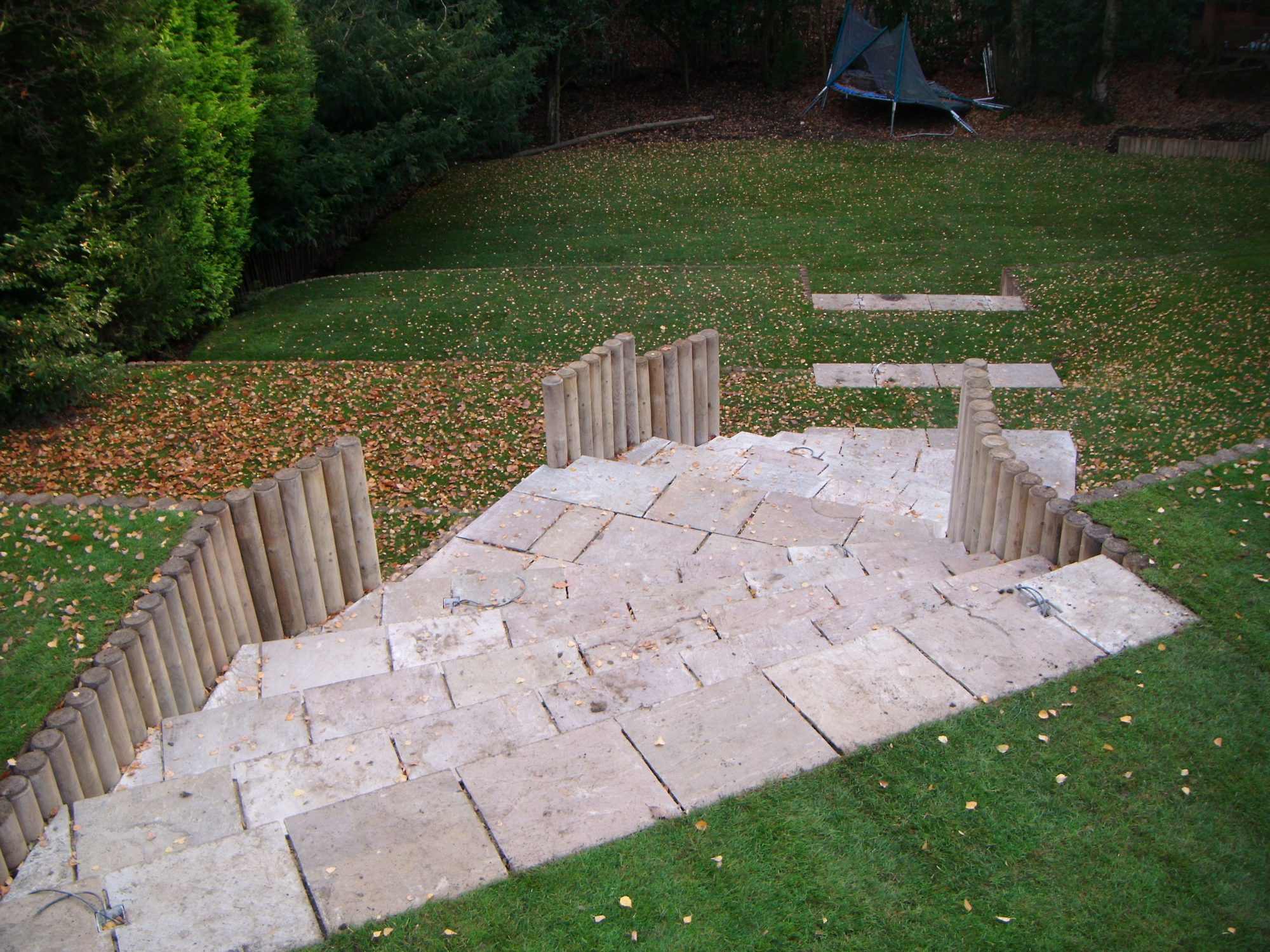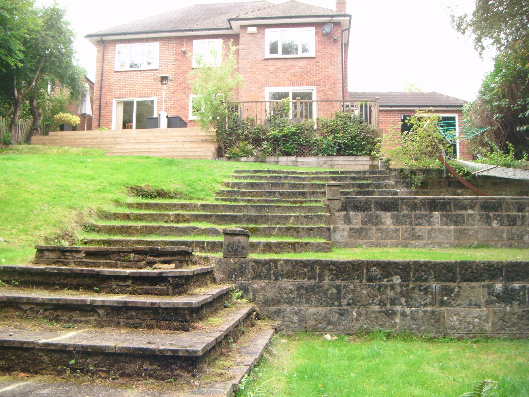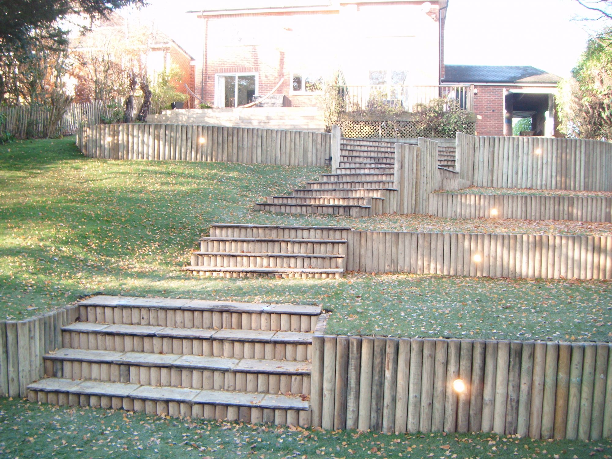 A previously inhospitable steeply sloping garden improved with a number of terraced areas utilising 500 wooden posts. Steps, also included were built with Indian sandstone.