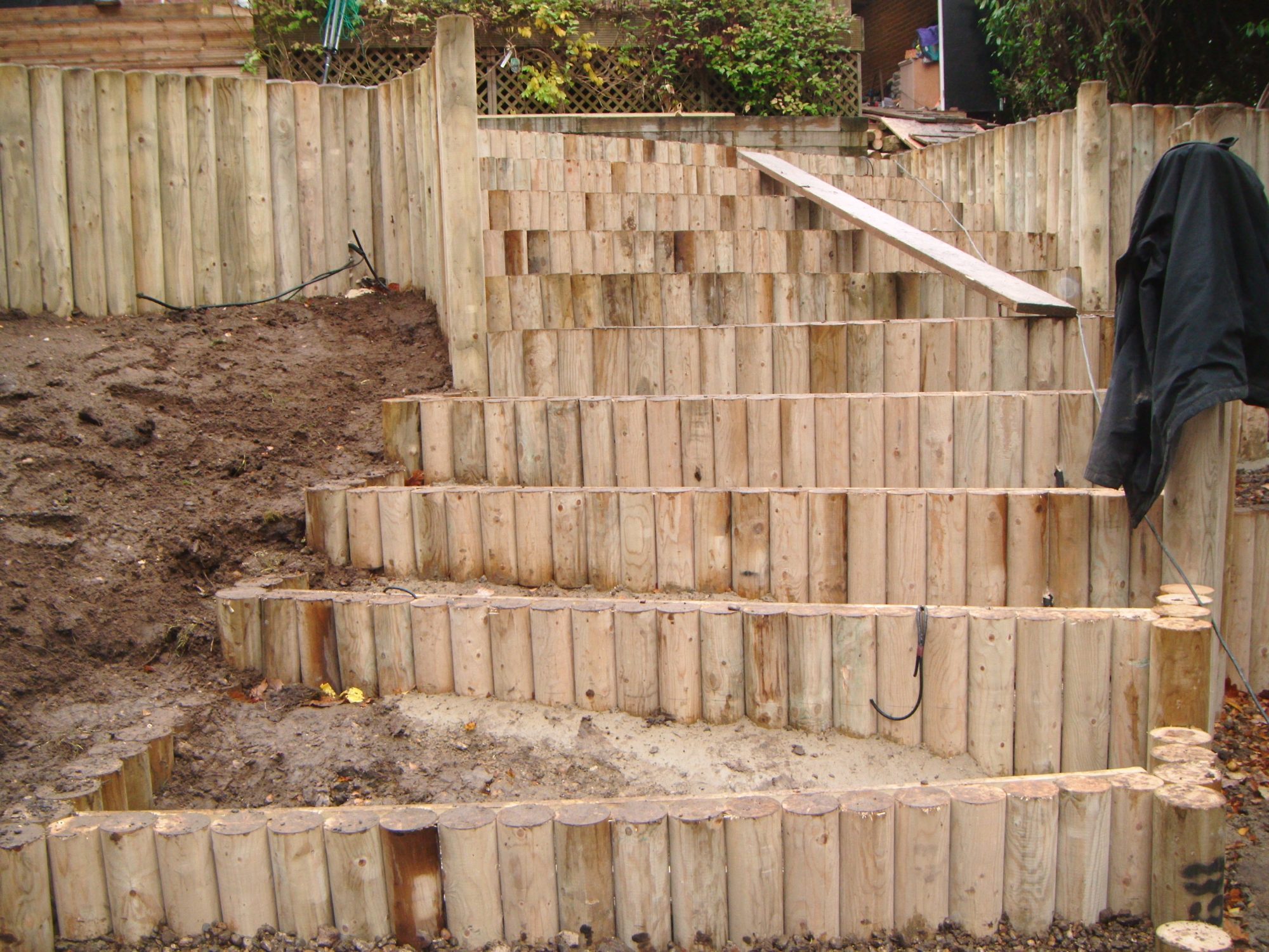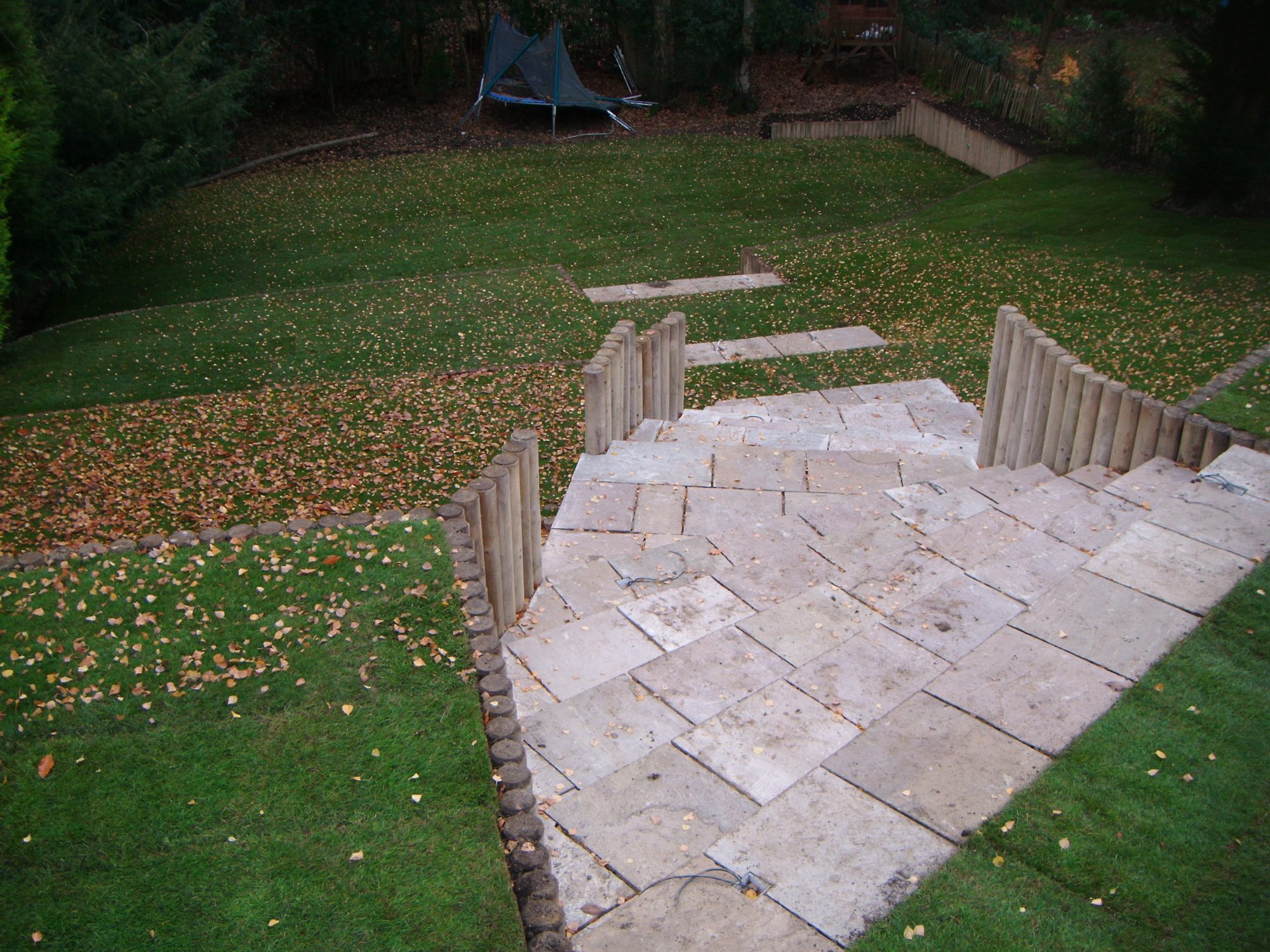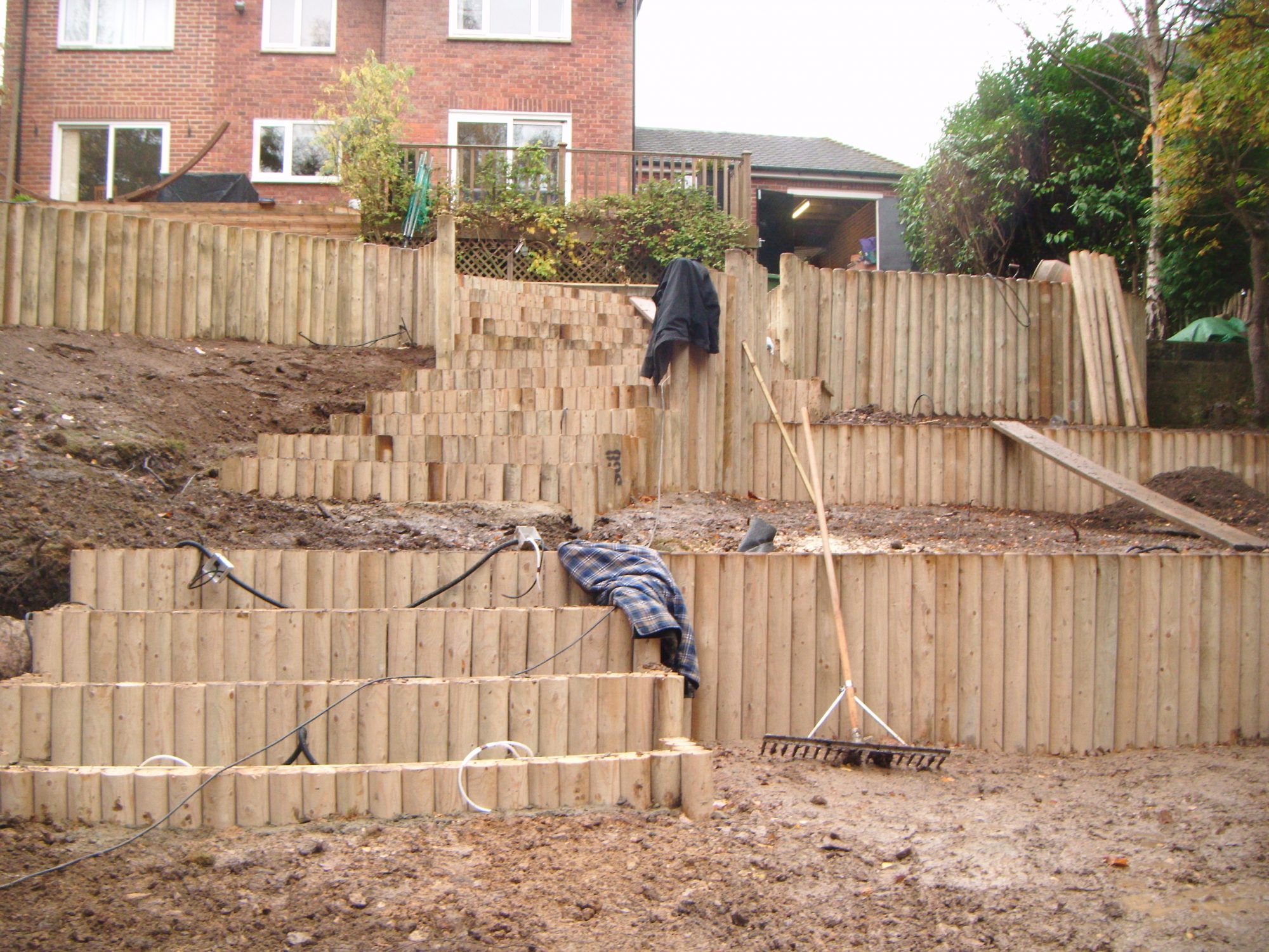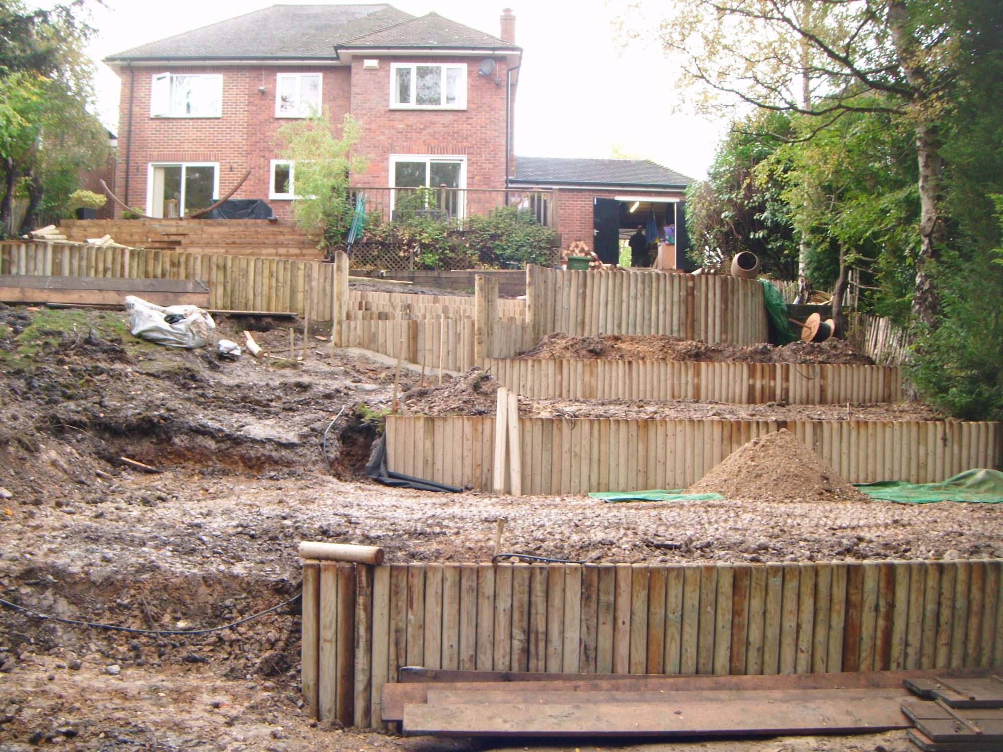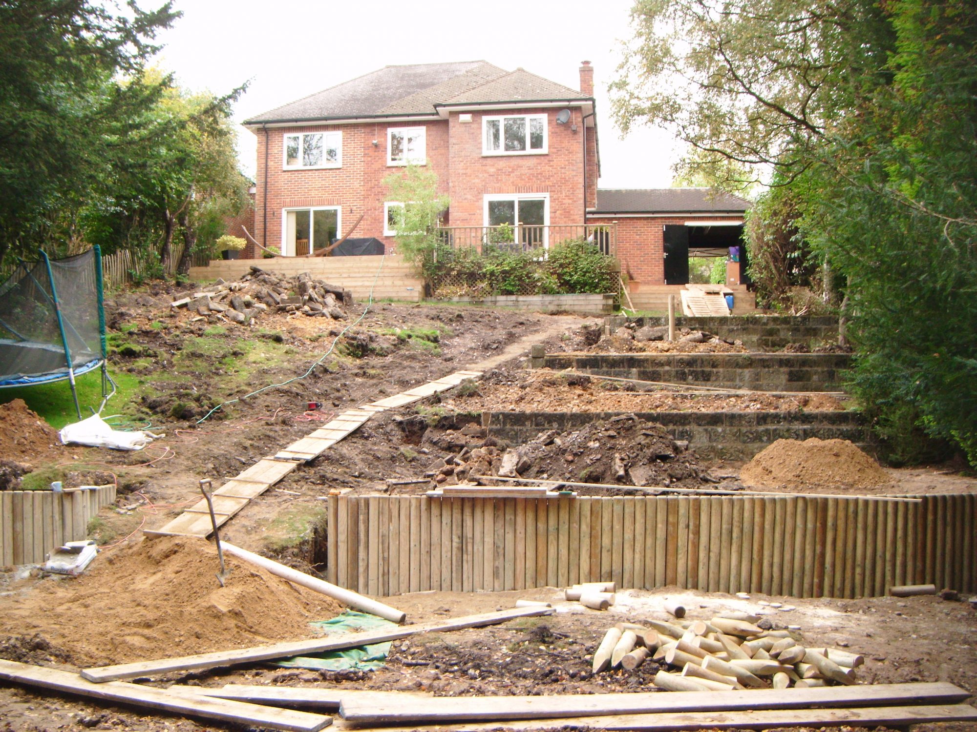 A previously inhospitable steeply sloping garden improved with a number of terraced areas utilising 500 wooden posts. Steps, also included were built with Indian sandstone.
