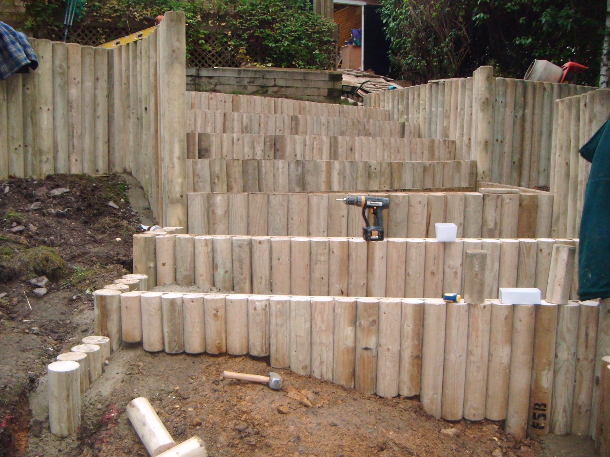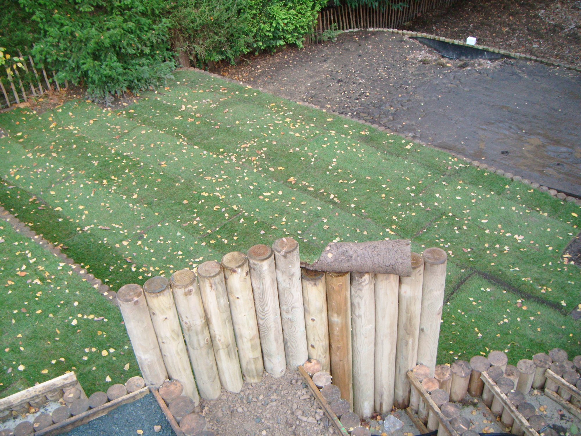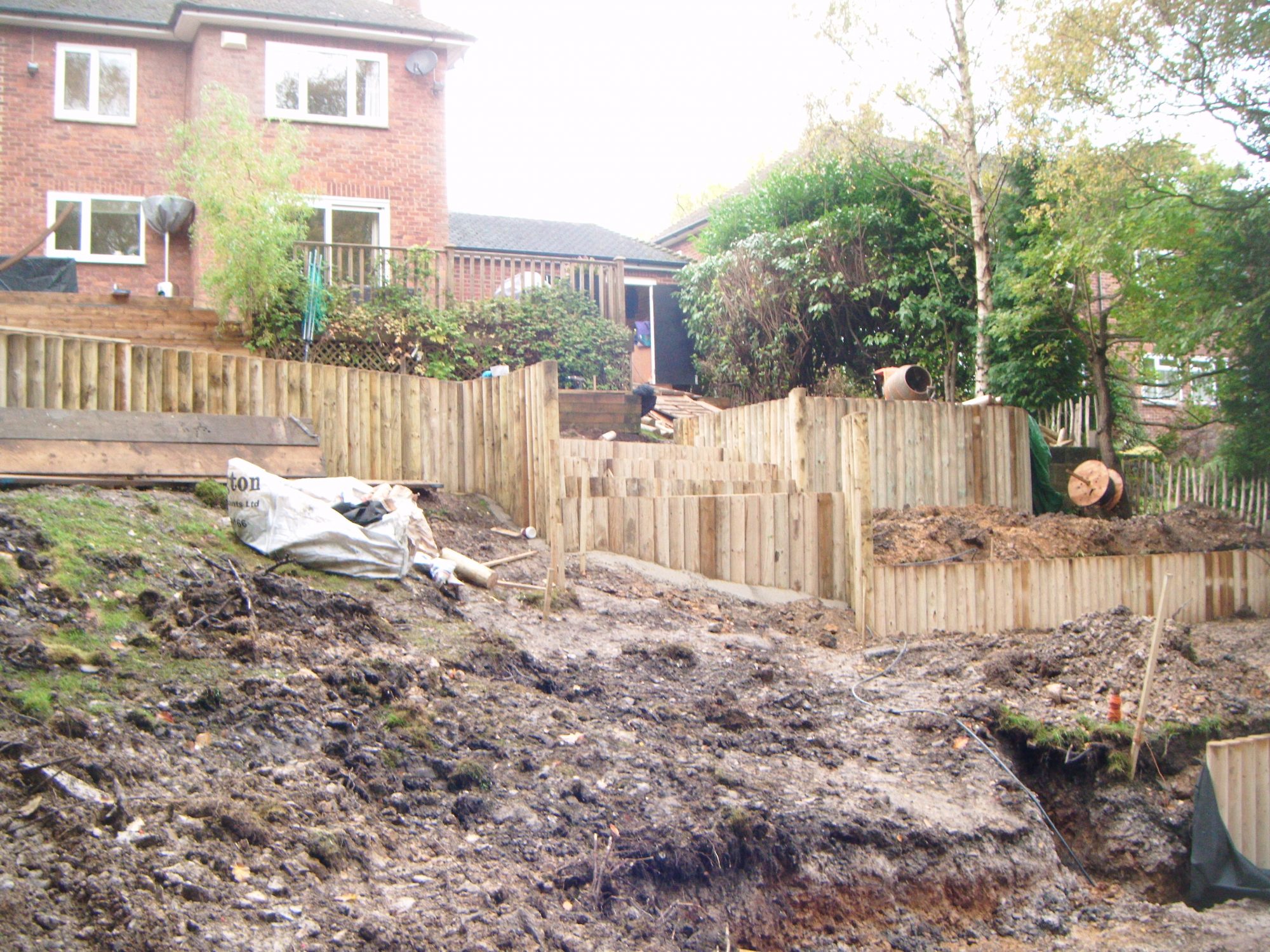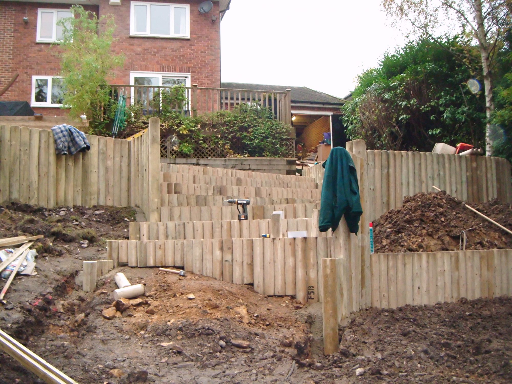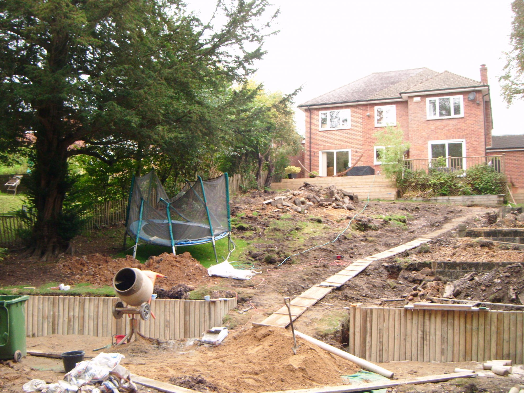 A previously inhospitable steeply sloping garden improved with a number of terraced areas utilising 500 wooden posts. Steps, also included were built with Indian sandstone.