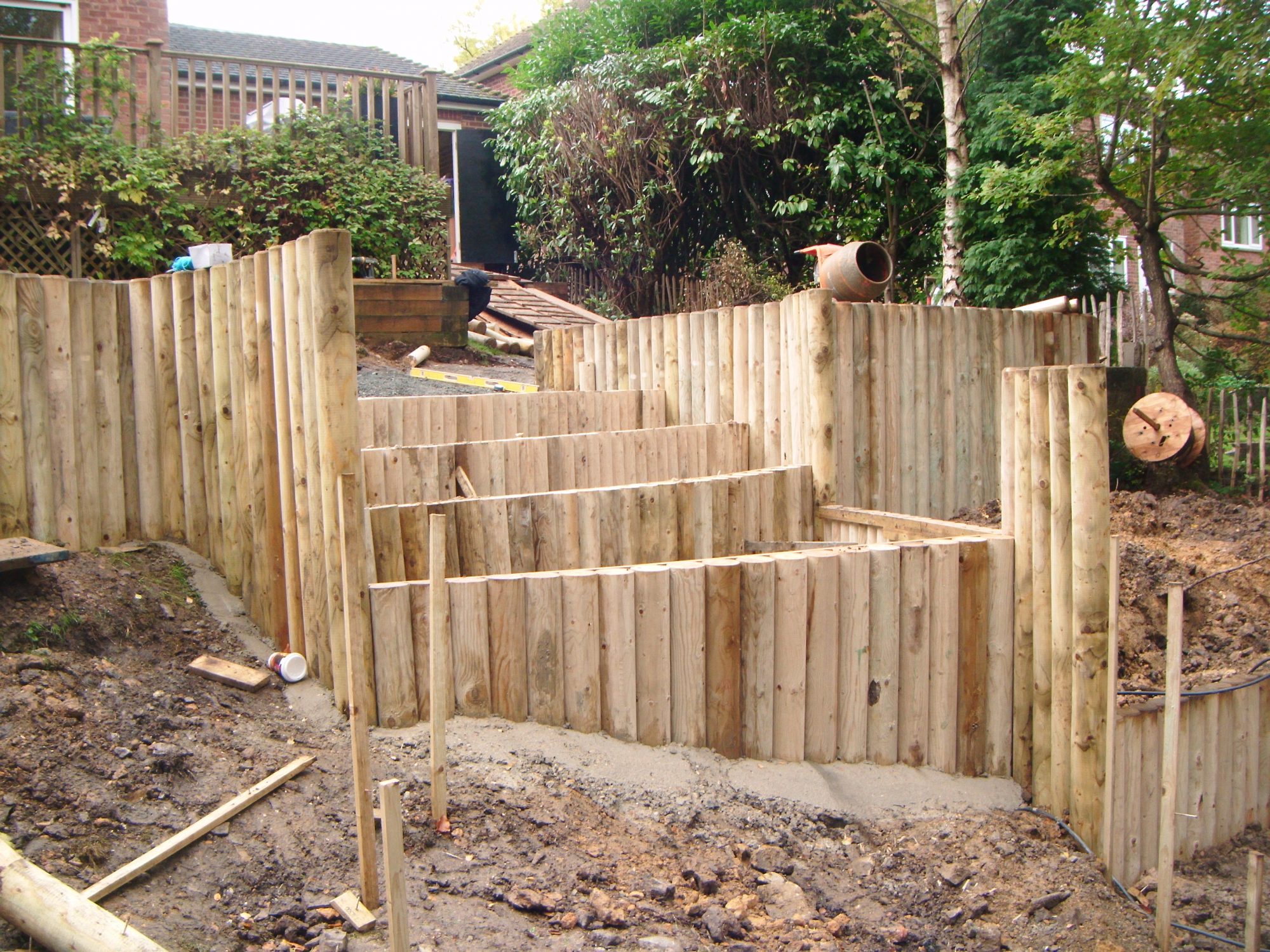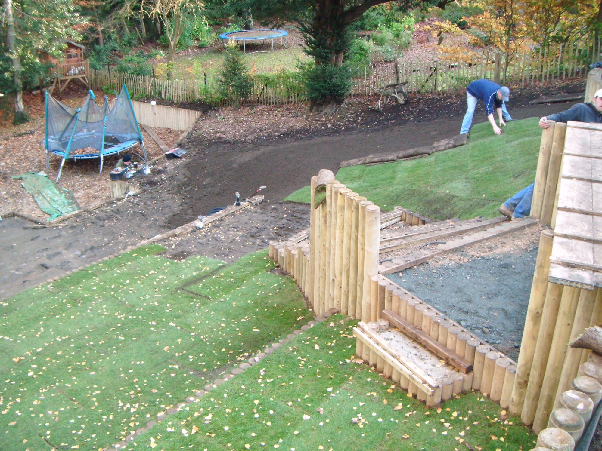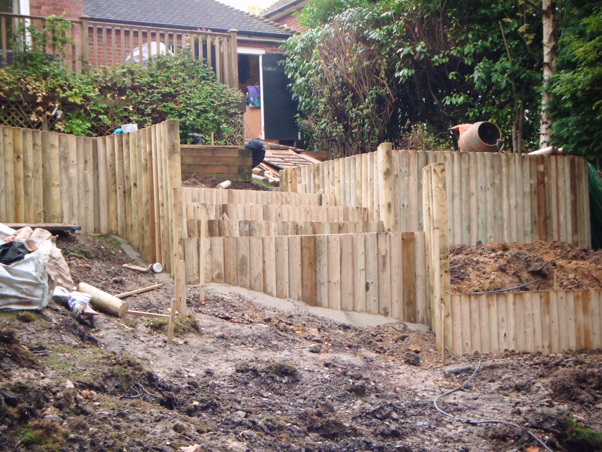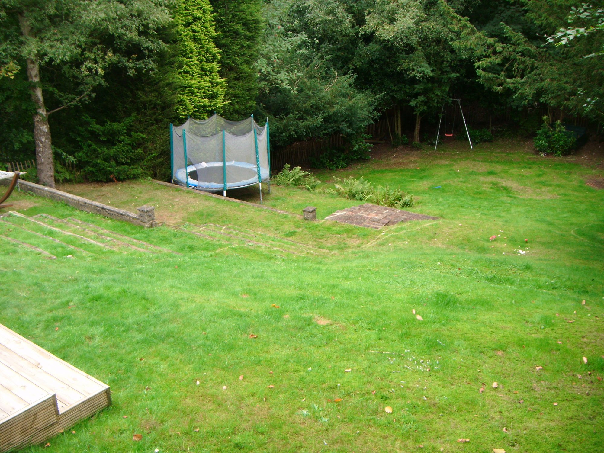 A previously inhospitable steeply sloping garden improved with a number of terraced areas utilising 500 wooden posts. Steps, also included were built with Indian sandstone.
