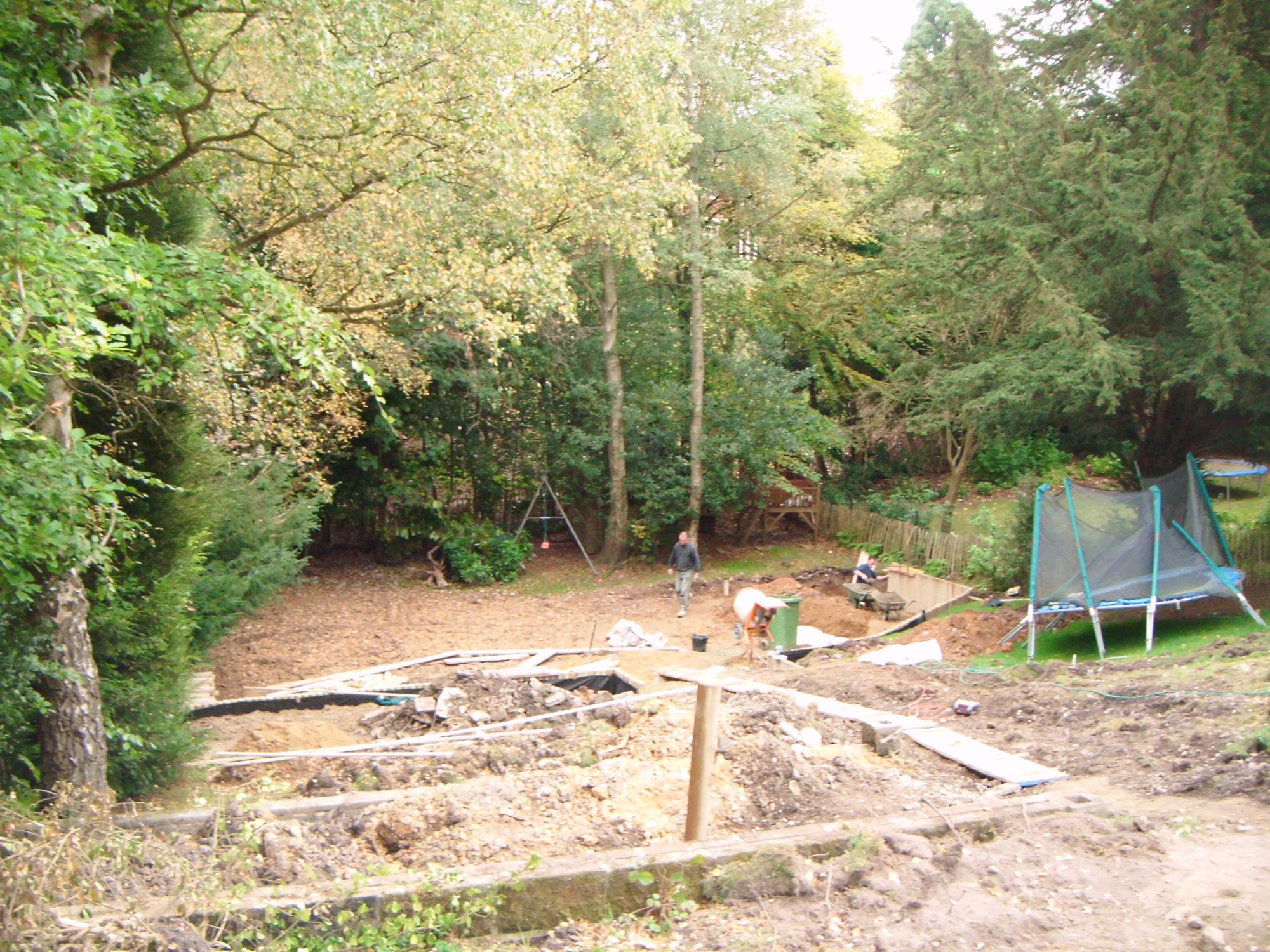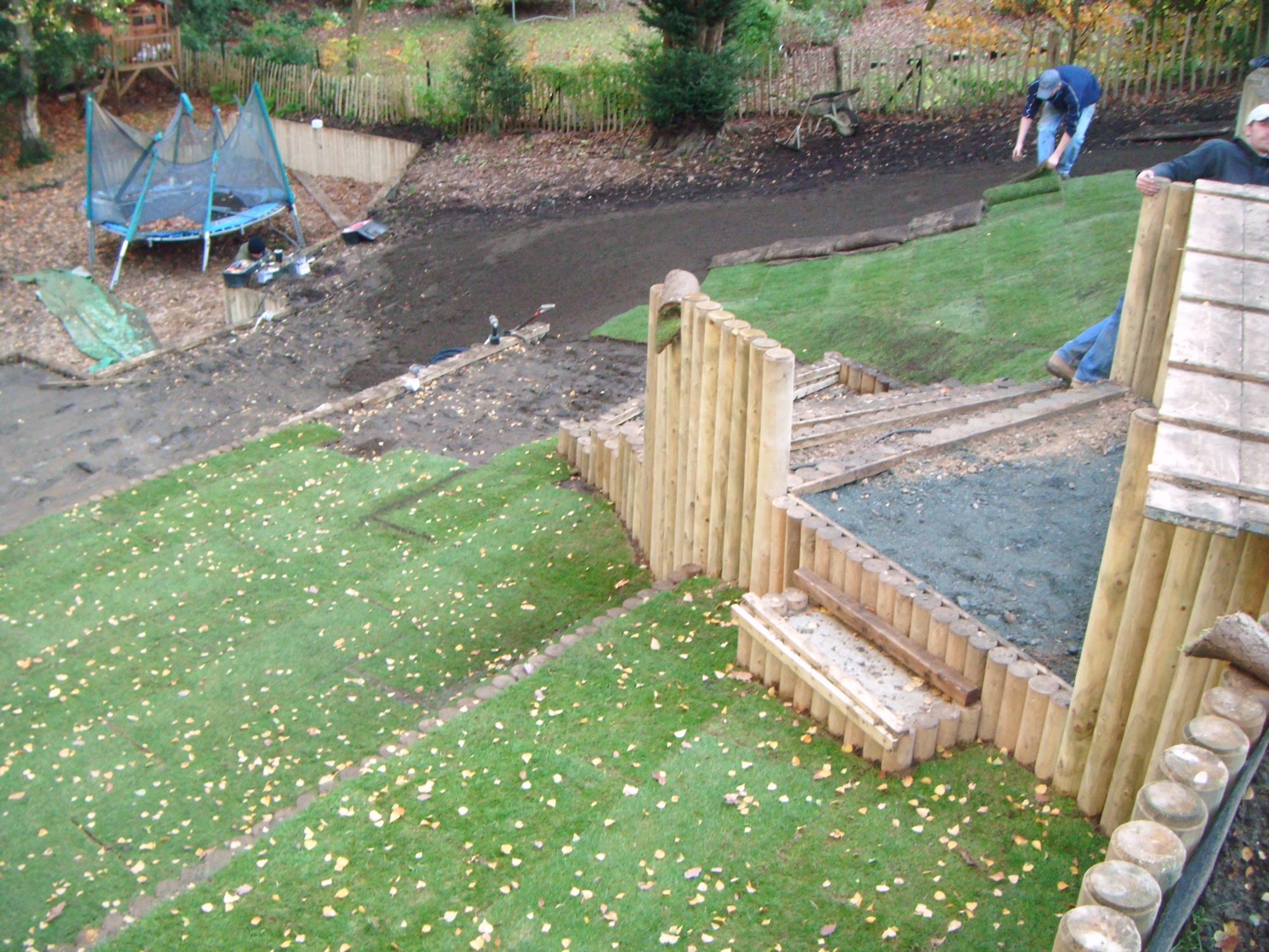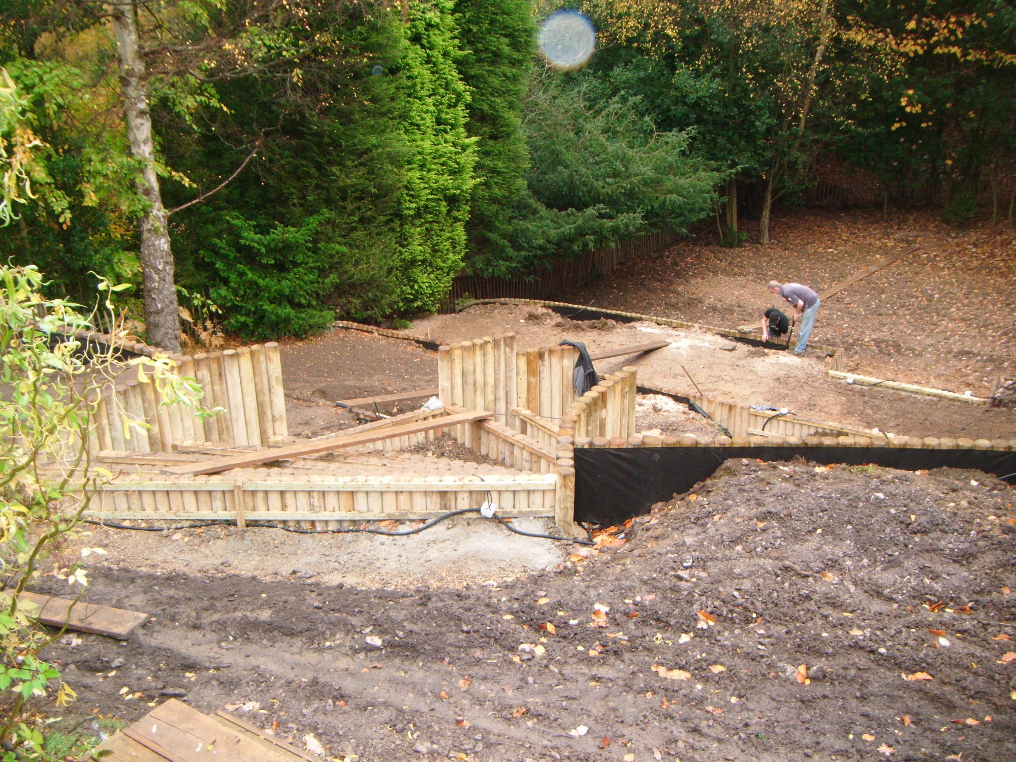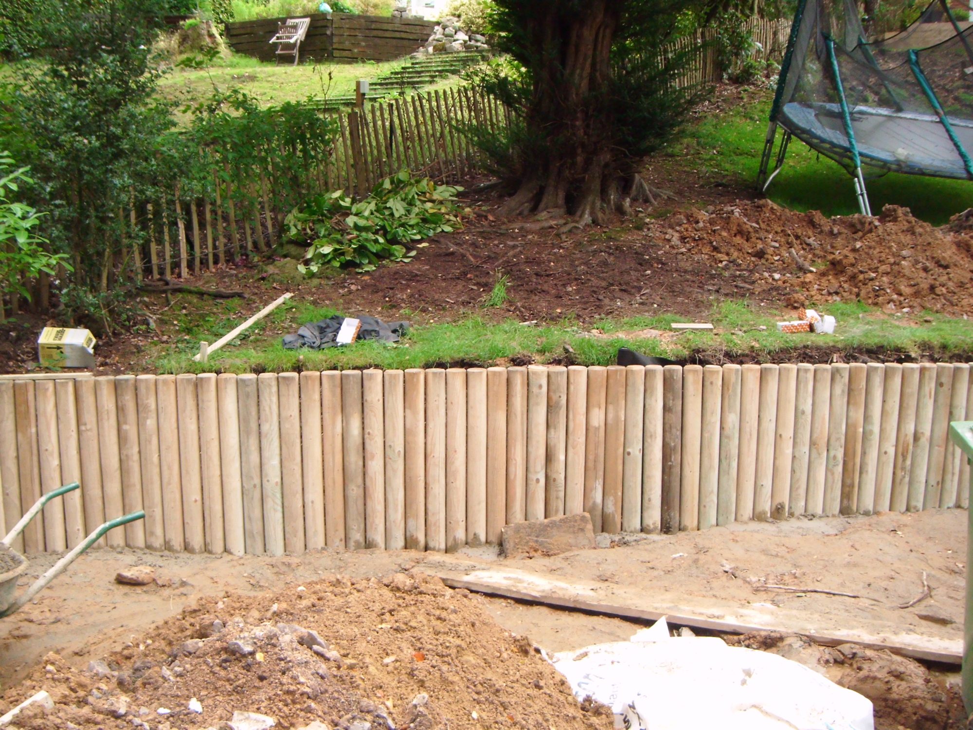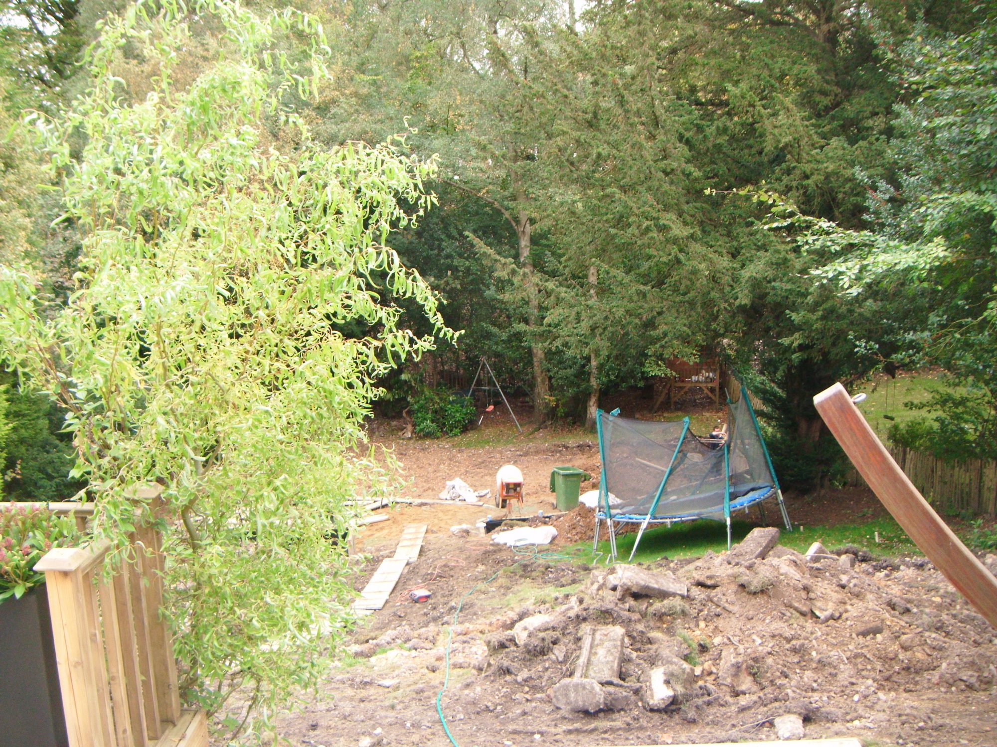 A previously inhospitable steeply sloping garden improved with a number of terraced areas utilising 500 wooden posts. Steps, also included were built with Indian sandstone.